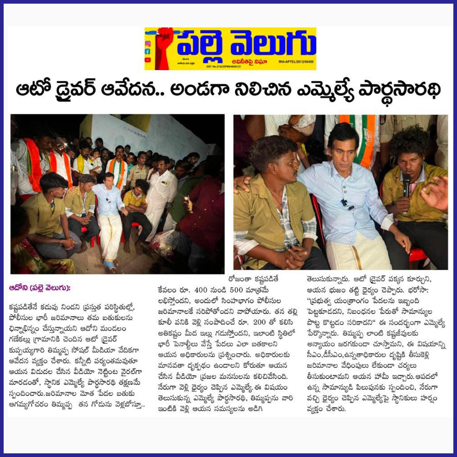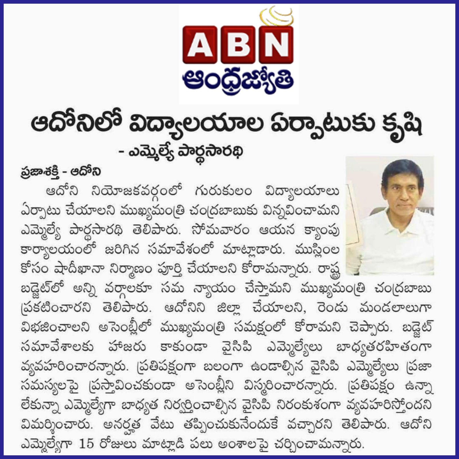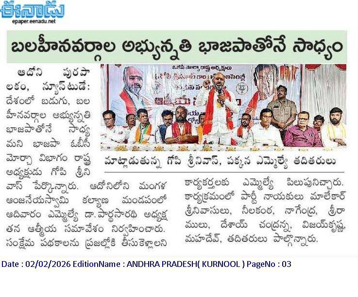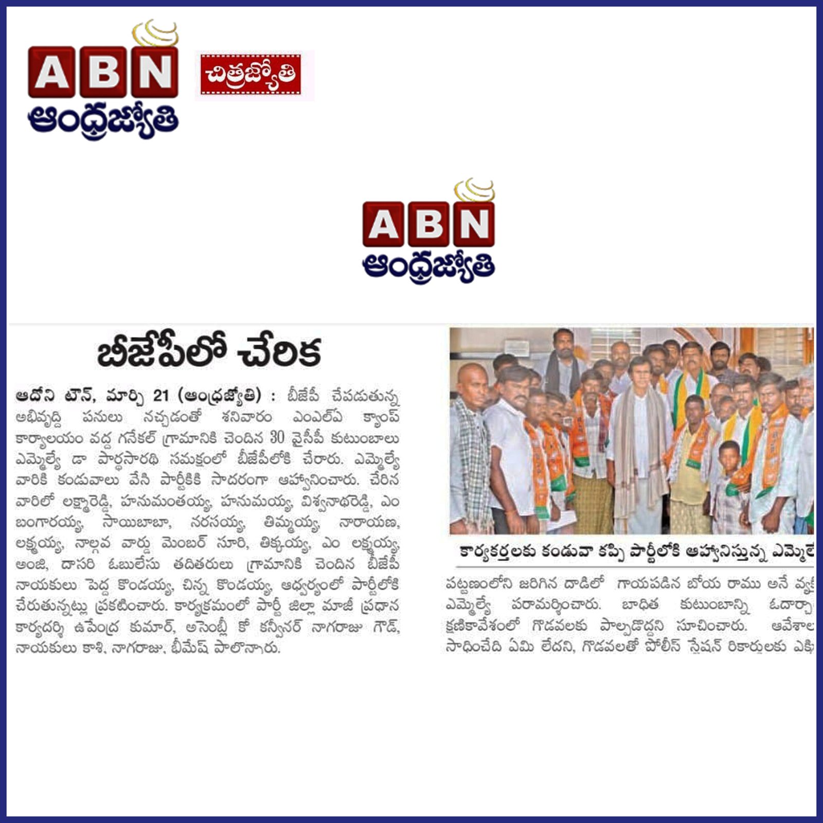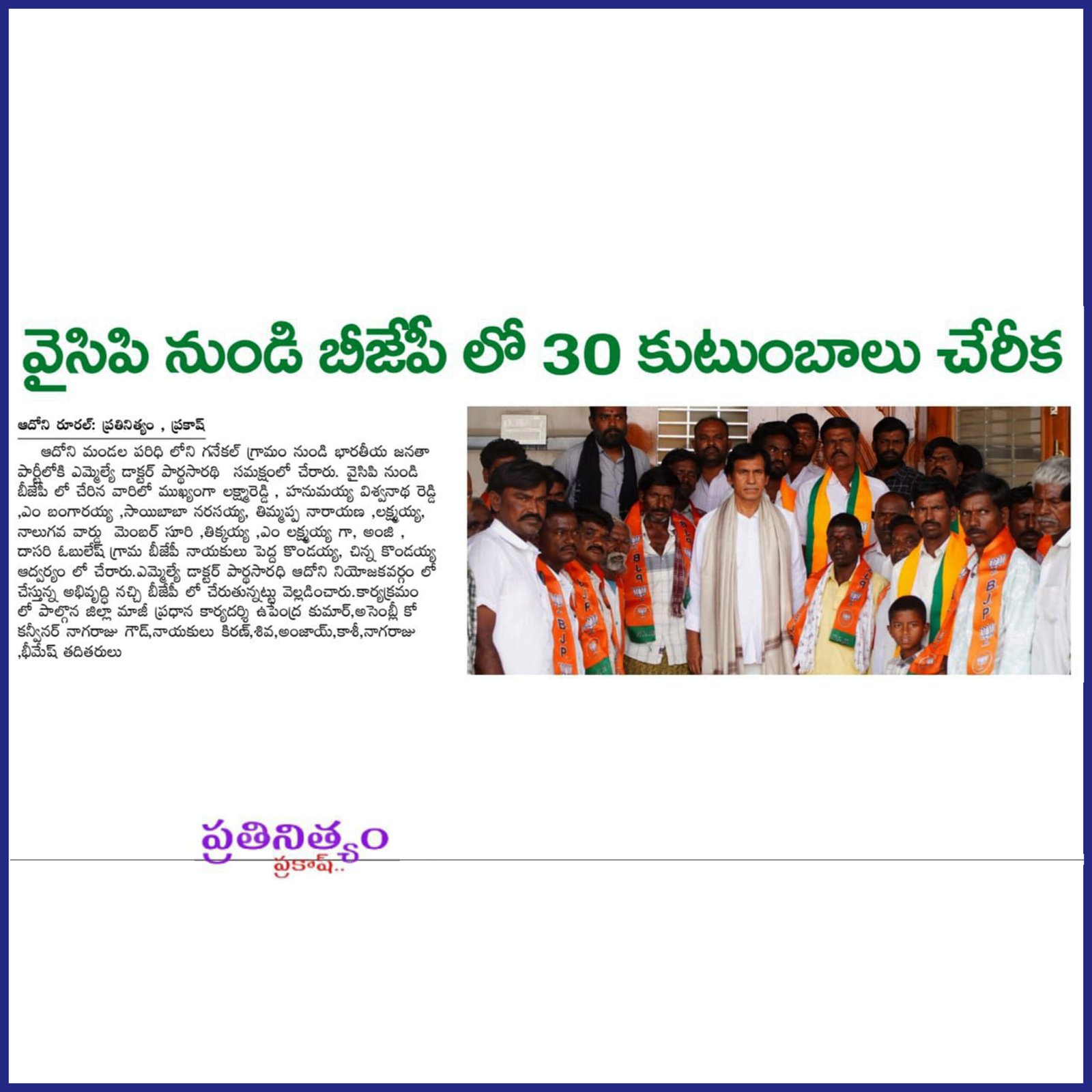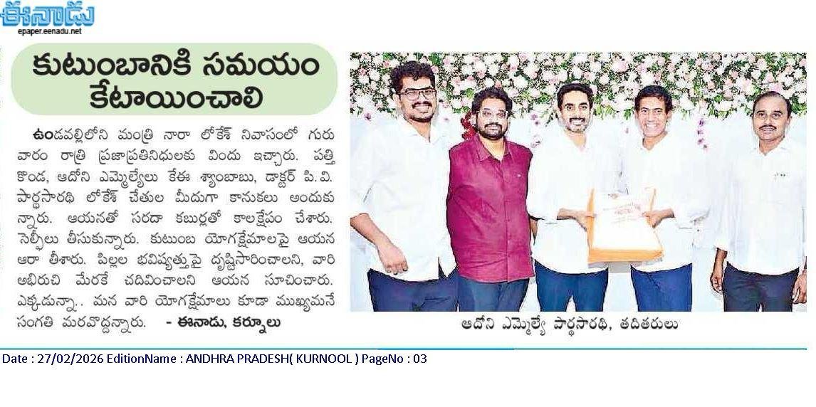 ఆంధ్రప్రదేశ్ రాష్ట్ర క్షేమమే లక్ష్యంగా భావించి, బీజేపీ–టిడిపి–జనసేన కూటమిగా ఏర్పడి 2024 ఆంధ్రప్రదేశ్ అసెంబ్లీ ఎన్నికల్లో విజయ ఢంకా మ్రోగించారు. ఈ ఎన్నికల్లో భారతీయ జనతా పార్టీ (బీజేపీ) తరఫున పోటీ చేసిన పి.వి. పార్థసారథి గారిని ఆదోని ప్రజలు అఖండ మెజారిటీ ఓట్లతో గెలిపించారు.