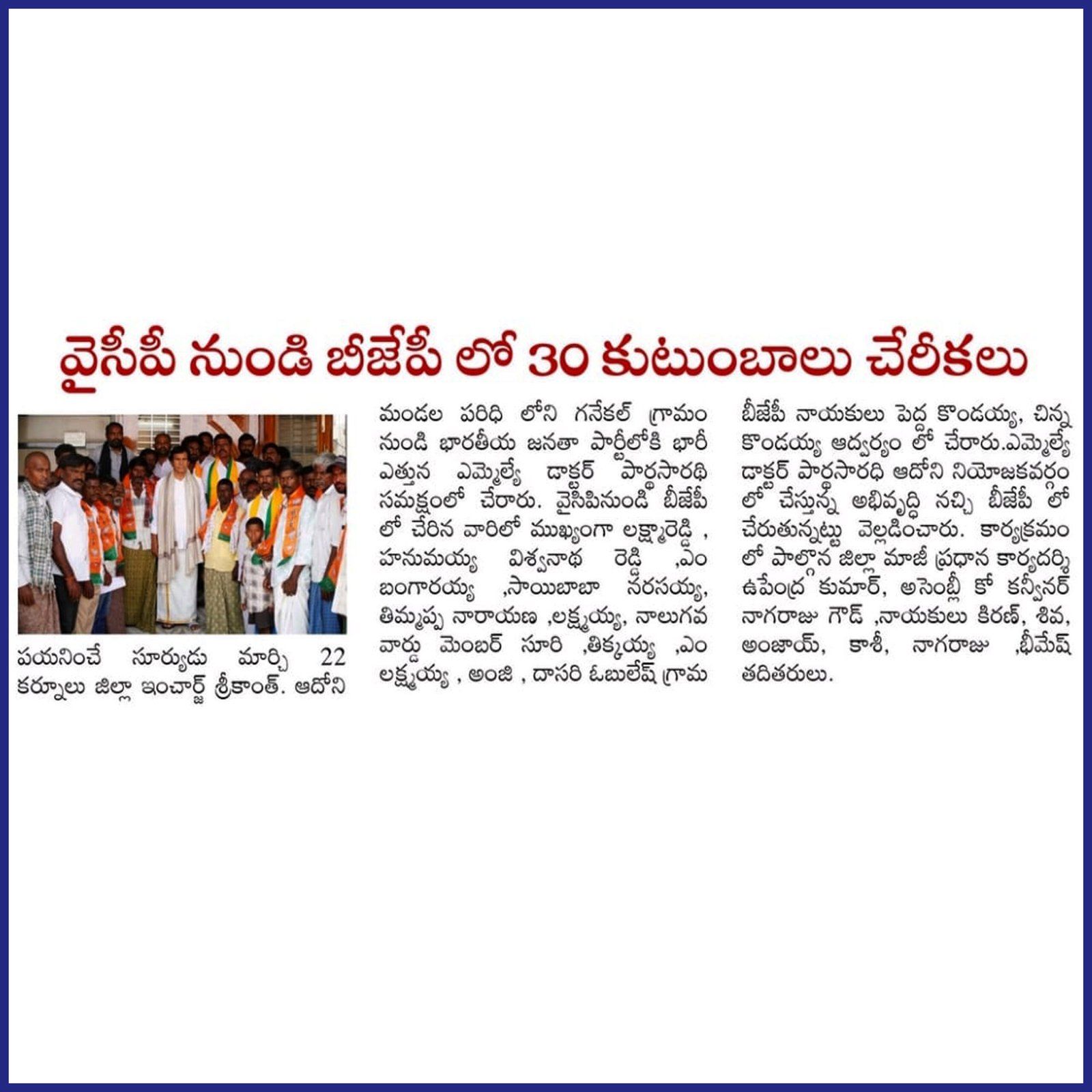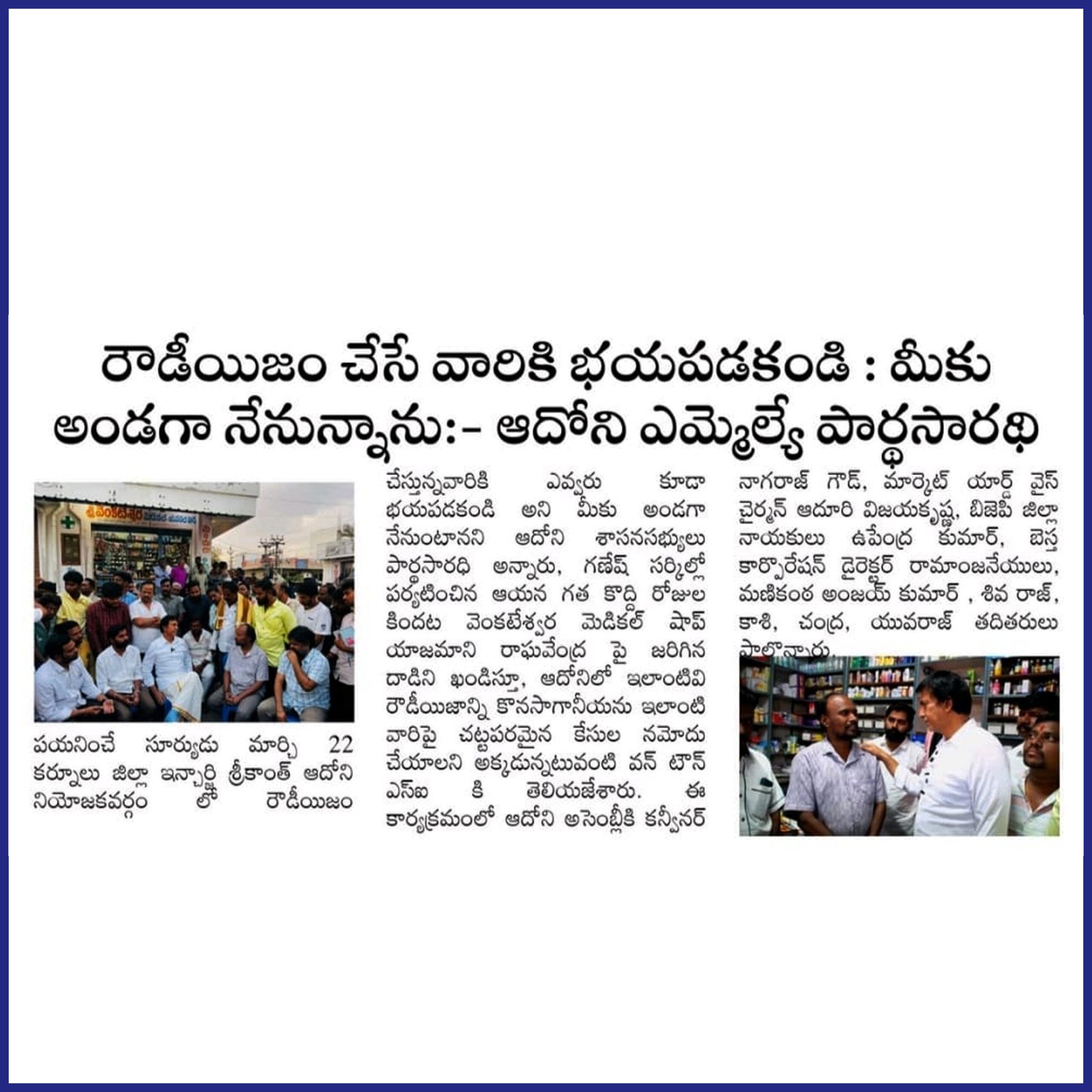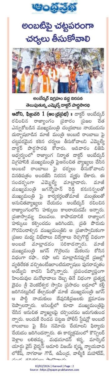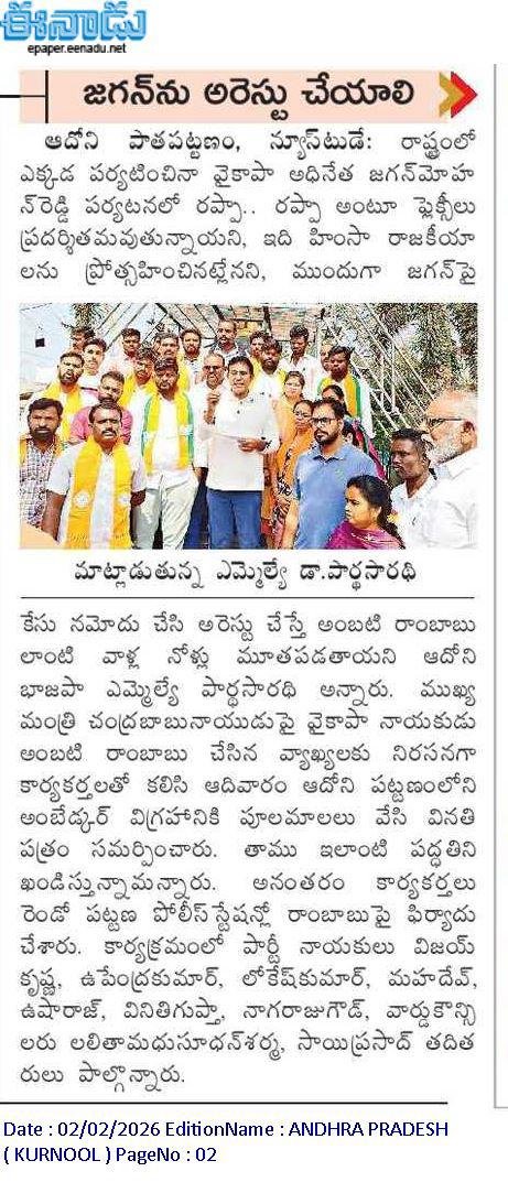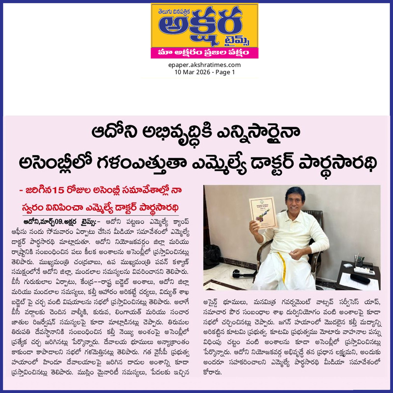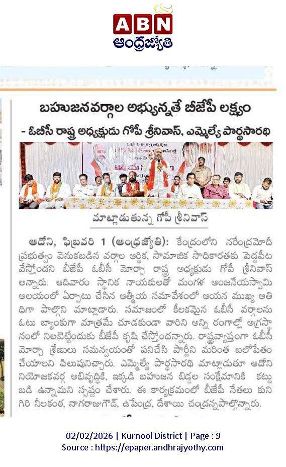 ఆంధ్రప్రదేశ్ రాష్ట్ర క్షేమమే లక్ష్యంగా భావించి, బీజేపీ–టిడిపి–జనసేన కూటమిగా ఏర్పడి 2024 ఆంధ్రప్రదేశ్ అసెంబ్లీ ఎన్నికల్లో విజయ ఢంకా మ్రోగించారు. ఈ ఎన్నికల్లో భారతీయ జనతా పార్టీ (బీజేపీ) తరఫున పోటీ చేసిన పి.వి. పార్థసారథి గారిని ఆదోని ప్రజలు అఖండ మెజారిటీ ఓట్లతో గెలిపించారు.